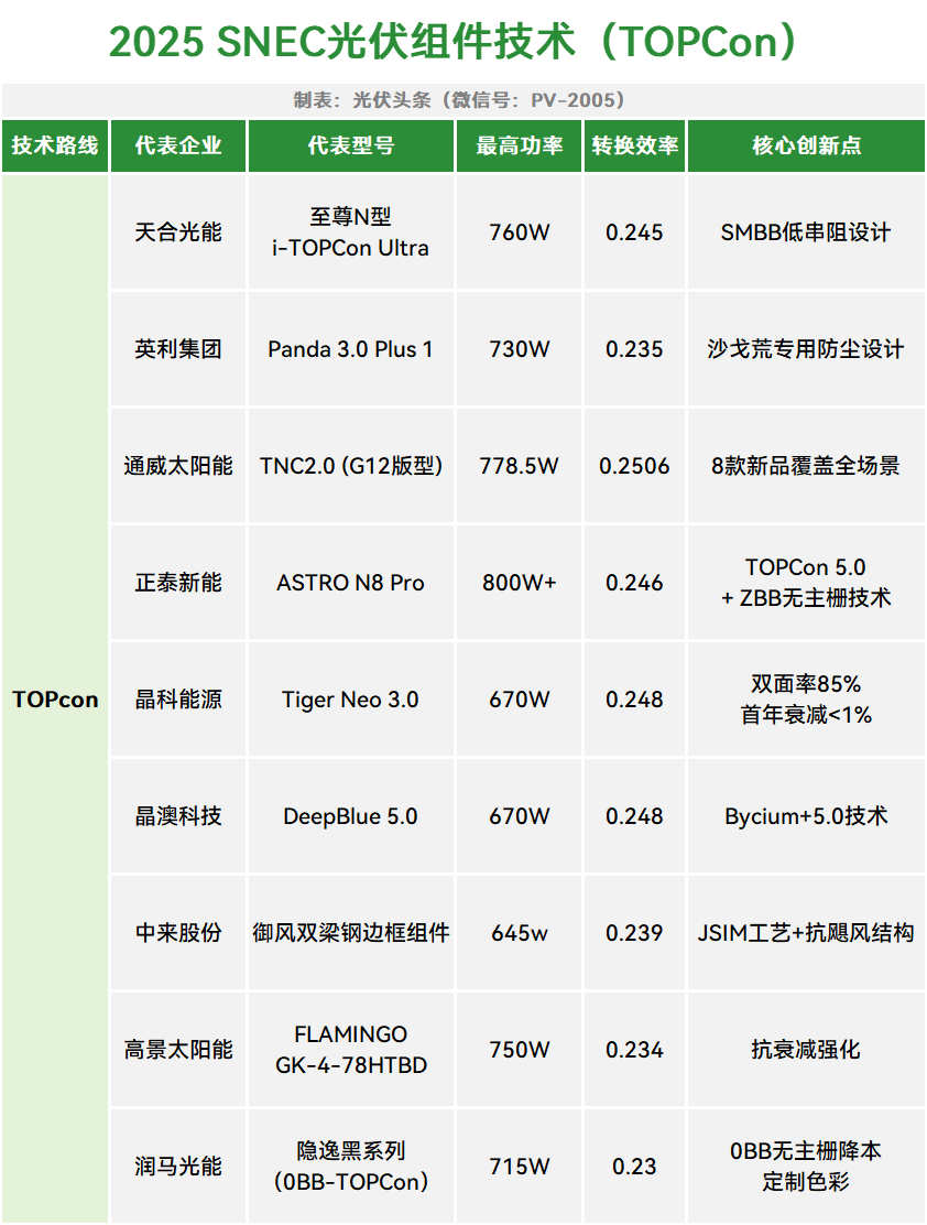 2025年TOPCon技术已全面主导量产市场,核心企业量产效率突破25% ,组件功率突破780W+,双面率提升至90%+。凭借双面微晶、超细栅线(SMBB)及0BB无主栅技术,显著降低了度电成本。