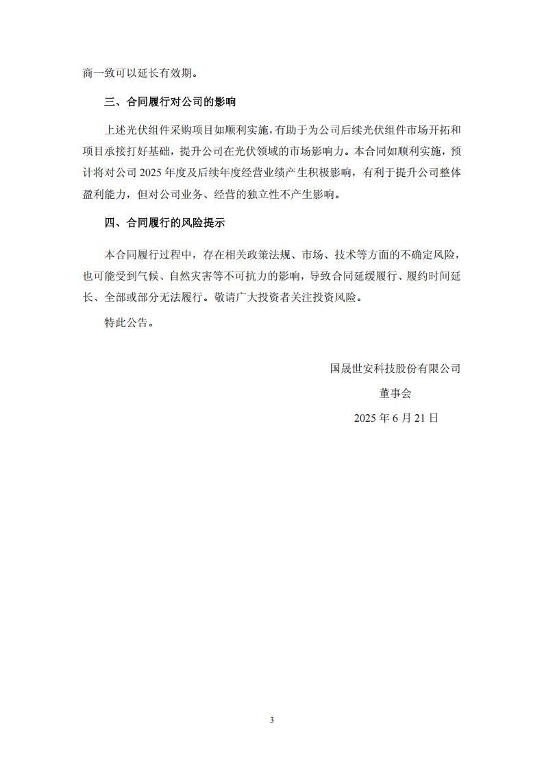 国晟科技表示,上述光伏组件采购项目如顺利实施,有助于为公司后续光伏组件市场开拓和项目承接打好基础,提升公司在光伏领域的市场影响力。本合同如顺利实施,预计将对公司2025年度及后续年度经营业绩产生积极影响,有利于提升公司整体盈利能力,但对公司业务、经营的独立性不产生影响。