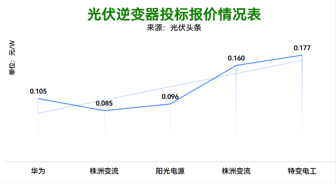 标段一大功率组串式逆变器 华为技术有限公司、株洲变流技术国家工程研究中心有限公司、阳光电源股份有限公司3家企业入围,投标单价0.085~0.105元/W;