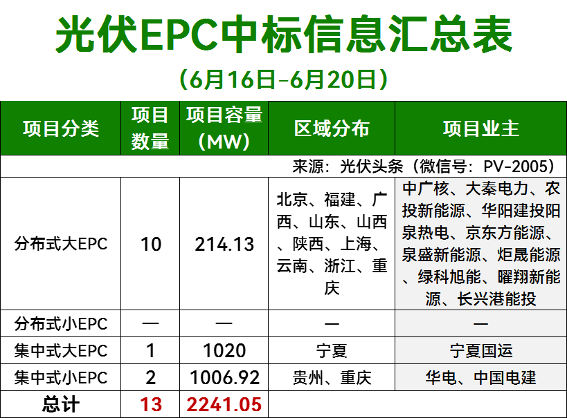 从项目的分类来看,中标方面,本周分布式大EPC项目为10个,项目容量为214.13MW。本周集中式大EPC项目1个,项目容量为1020MW。