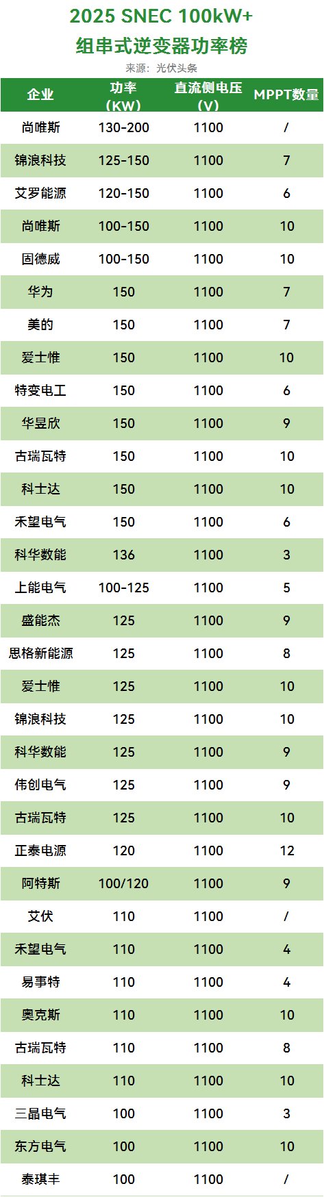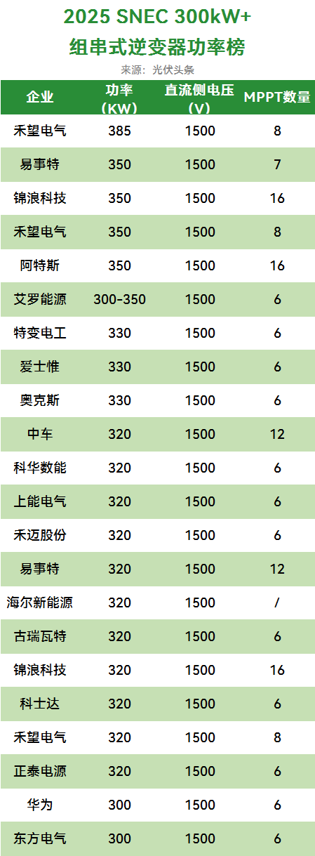 光伏头条观察,在2024年SNEC中,一众光伏逆变器龙头推出了350kW组串式逆变器。2025年,阳光电源、特变电工、中车、正泰电源等光伏逆变器龙头迅速将逆变器引入了400kW+时代。