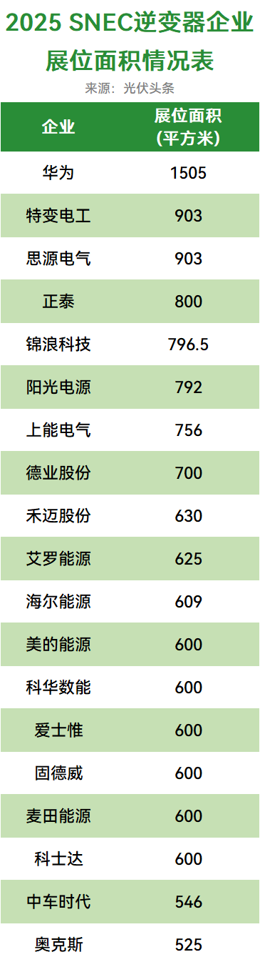 光伏展会的展位面积是企业实力与投入程度最直接的反应。光伏头条统计,今年SNEC展位超500平方米的企业有52家,逆变器企业有19家。