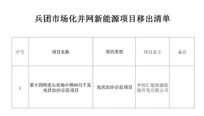 关于第十四师皮山农场中核60万千瓦光伏治沙示范项目移出兵团市场化并网新能源项目清单的公示