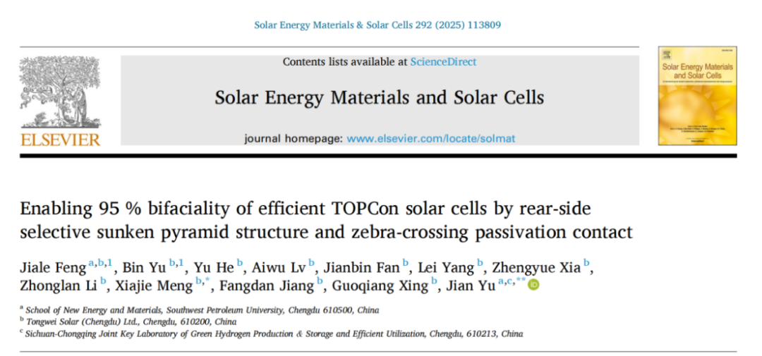 作为全球领先的光伏企业,通威坚持技术创新,深入推进产学研合作。该项技术成果以题为《Enabling 95 % bifaciality of efficient TOPCon solar cells by rear-side selective sunken pyramid structure and zebra-crossing passivation contact》的论文正式发表在国际著名学术期刊《 Solar Energy Materials and Solar Cells 》。论文由通威与西南石油大学研究团队合作完成。