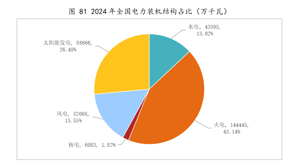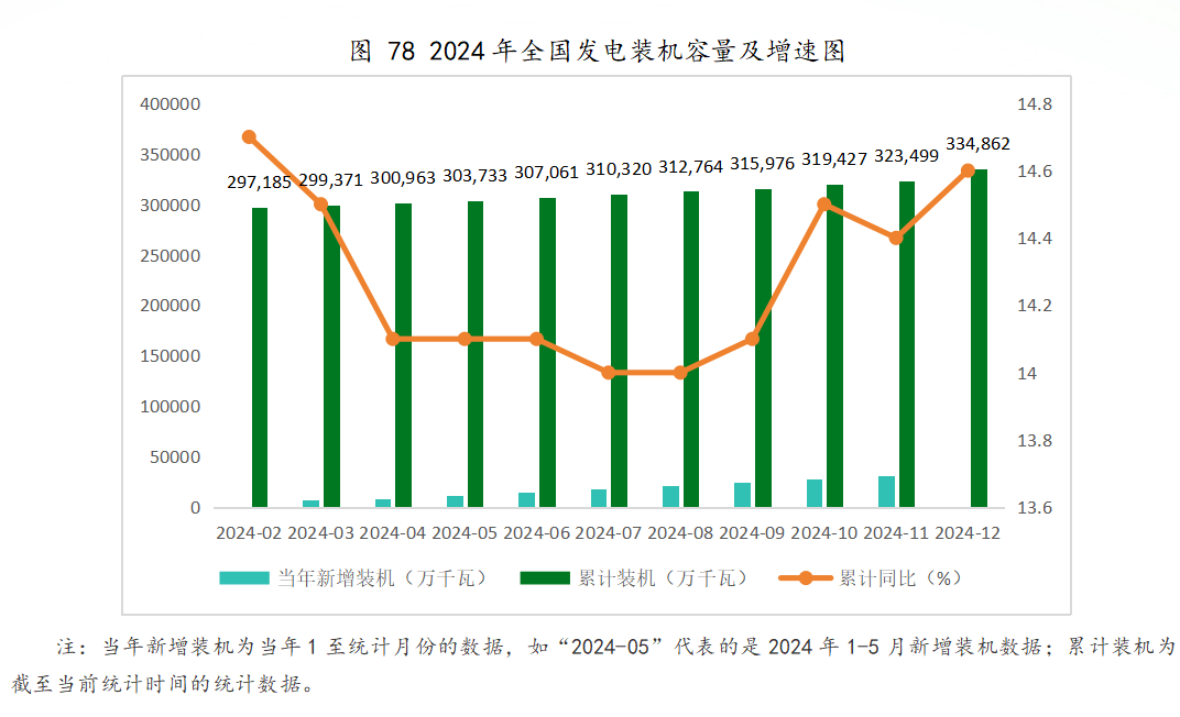 截至2024年12月底,全国累计发电装机容量334862万千瓦,同比增长14.6%。其中,水电装机容量43595万千瓦,同比增长3.2%;火电装机容量144445万千瓦,同比增长3.8%;核电装机容量6083万千瓦,同比增长6.9%;并网风电装机容量52068万千瓦,同比增长18.0%;并网太阳能发电装机容量88666万千瓦,同比增长45.2%。