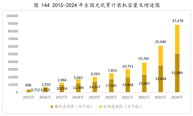 报告数据显示:2024年我国太阳能发电装机容量持续增长,展现出巨大的发展潜力。全国光伏新增装机2.77亿千瓦,同比增长28%。其中,集中式光伏1.59亿千瓦,分布式光伏1.18亿千瓦。全国光伏累计装机容量8.87亿千瓦,同比增长45.2%。其中,集中式光伏5.11亿千瓦,分布式光伏3.75亿千瓦。