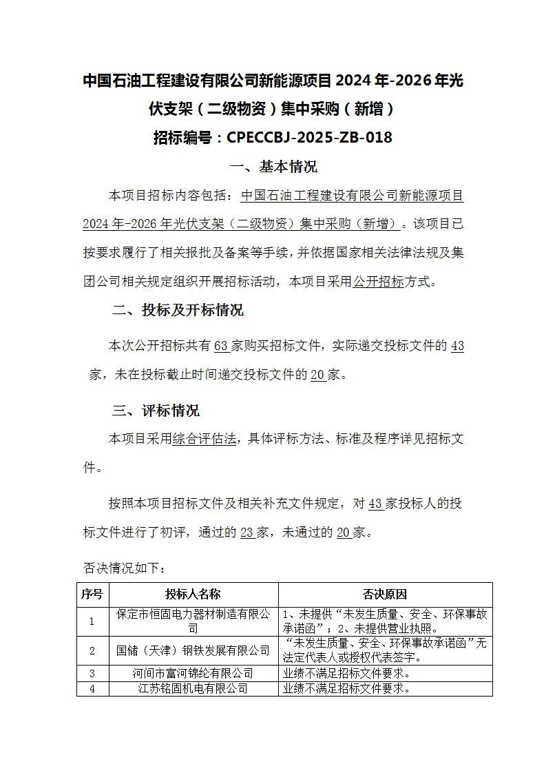 光伏头条获悉,7月4日,中国石油工程建设有限公司新能源项目2024年-2026年光伏支架(二级物资)集中采购(新增)中标候选人公示。