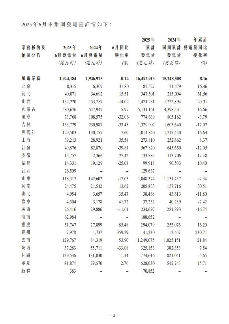 7月10日,大唐新能源发布2025年6月发电量公告。
