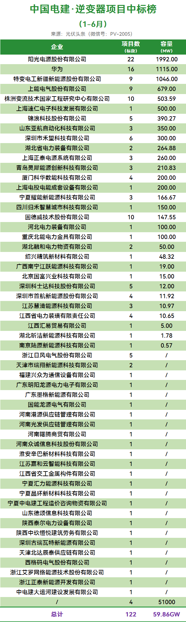 虽然光伏逆变器行业格局相对稳定,但在央企的项目中,考虑价格、市场渠道、后期服务等方面,也有大量企业赢得了央企的订单。光伏头条根据公开信息整理详细榜单如下: