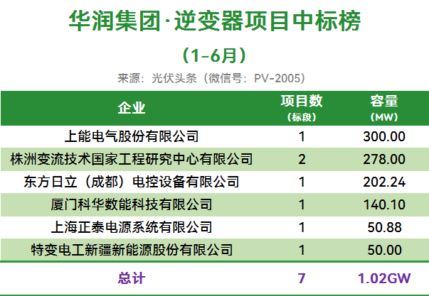 2025年上半年,华润集团有7个项目定标,合计容量1.02GW。