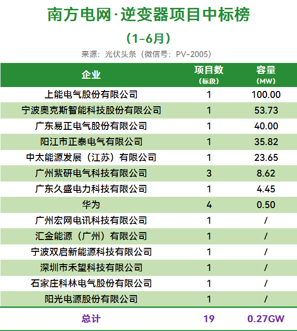 南方电网1-6月有19个项目定标,合计容量0.27GW。