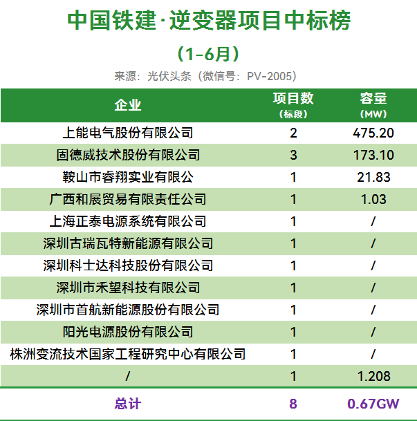 中国铁建有8个逆变器采购项目定标,合计容量0.67GW。