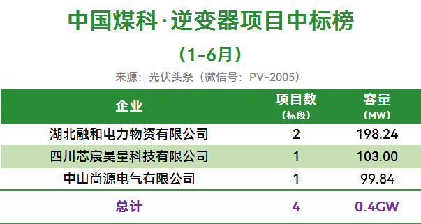 中国煤科有4个项目定标,合计容量0.4GW。湖北融和电力物资有限公司、四川芯宸昊量科技有限公司、中山尚源电气有限公司最终中标。