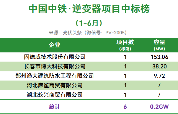 中国中铁有6个项目定标,合计容量0.2GW。固德威等5家企业最终中标。