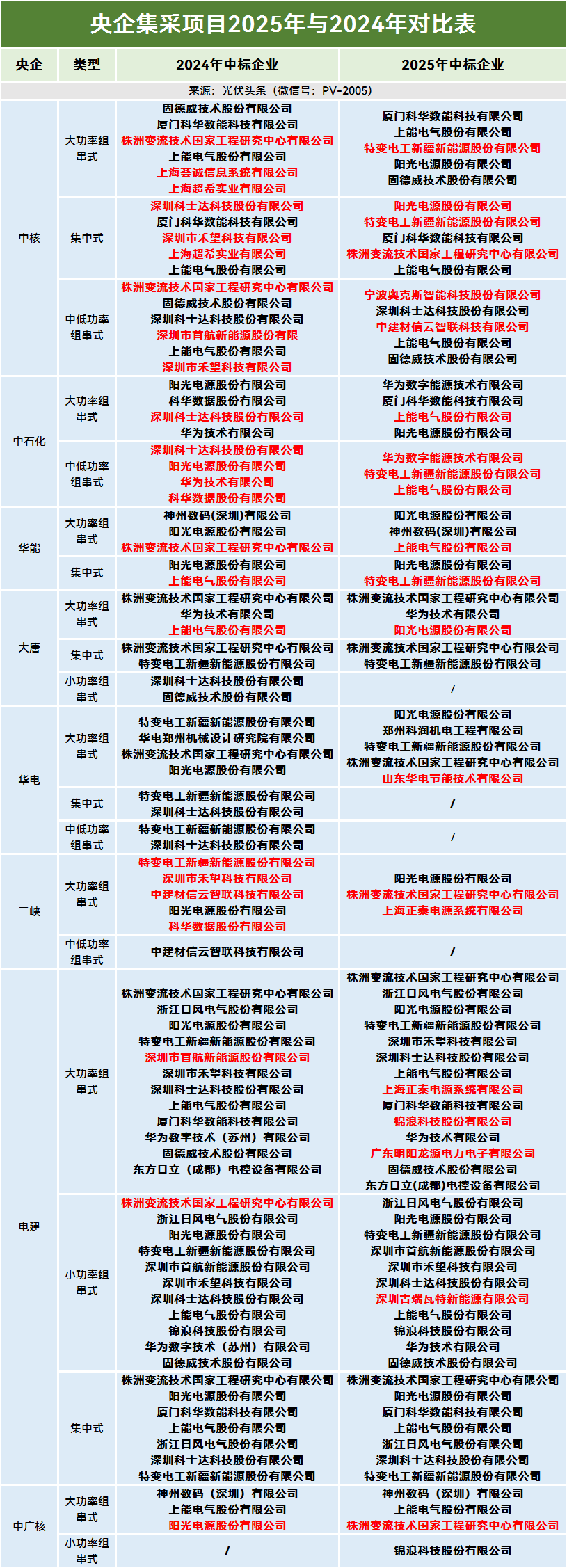 光伏头条对比中核、中石化、华能、大唐、华电、三峡、电建、中广核集采项目2024年与2025年入围企业名单如下: