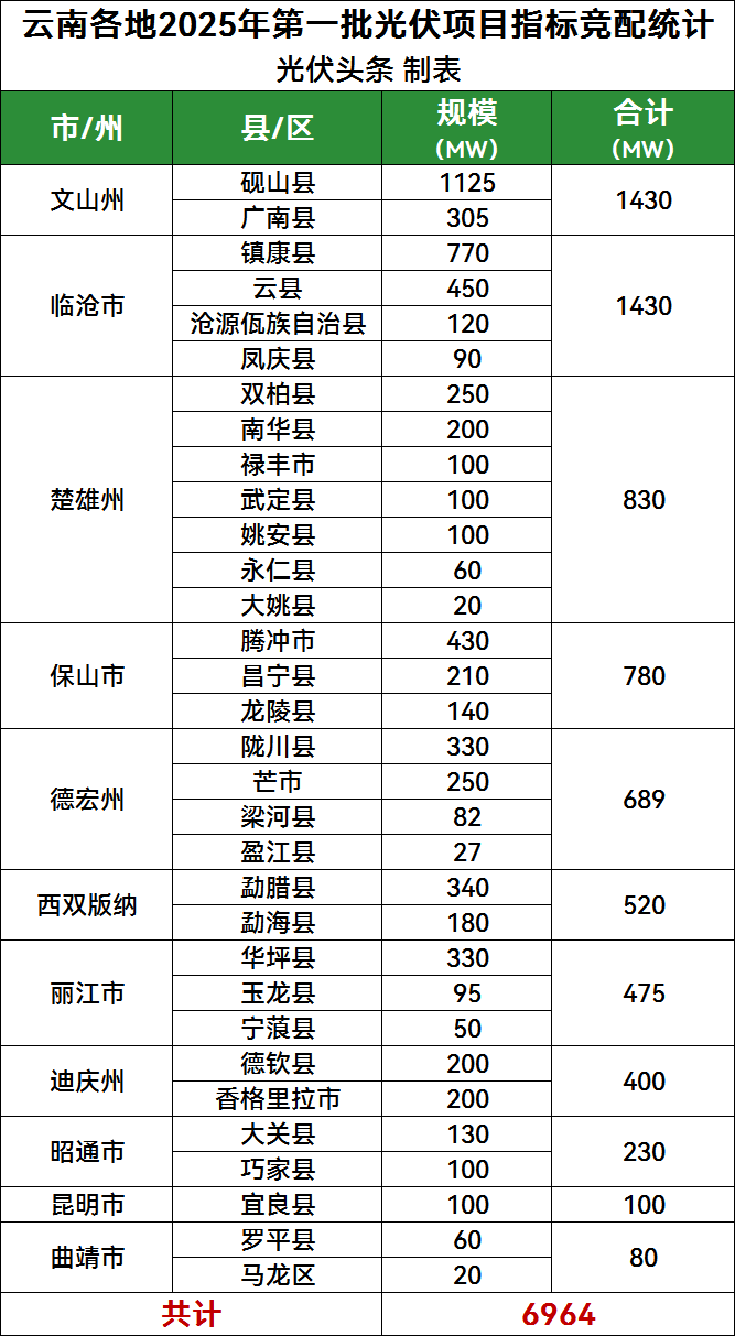 其中,从各市/州竞配工作进展情况来看,文山州、临沧市以规模1430MW并列第一,楚雄州以规模830MW排名第二,保山市以780MW位列第三。
