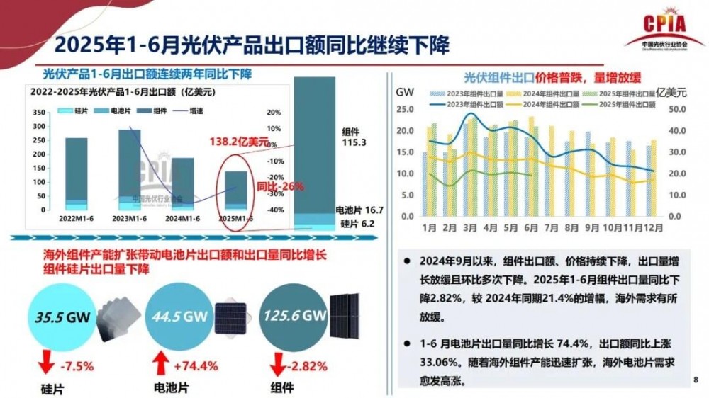 2024年9月以来,组件出口额、价格持续下降,出口量增长放缓且环比多次下降。2025年1-6月组件出口量同比下降2.82%,较2024年同期21.4%的增幅,海外需求有所放缓。