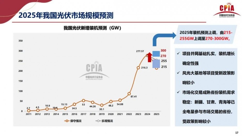 2025年我国光伏装机预测上调,由215-255GW上调至270-300GW。