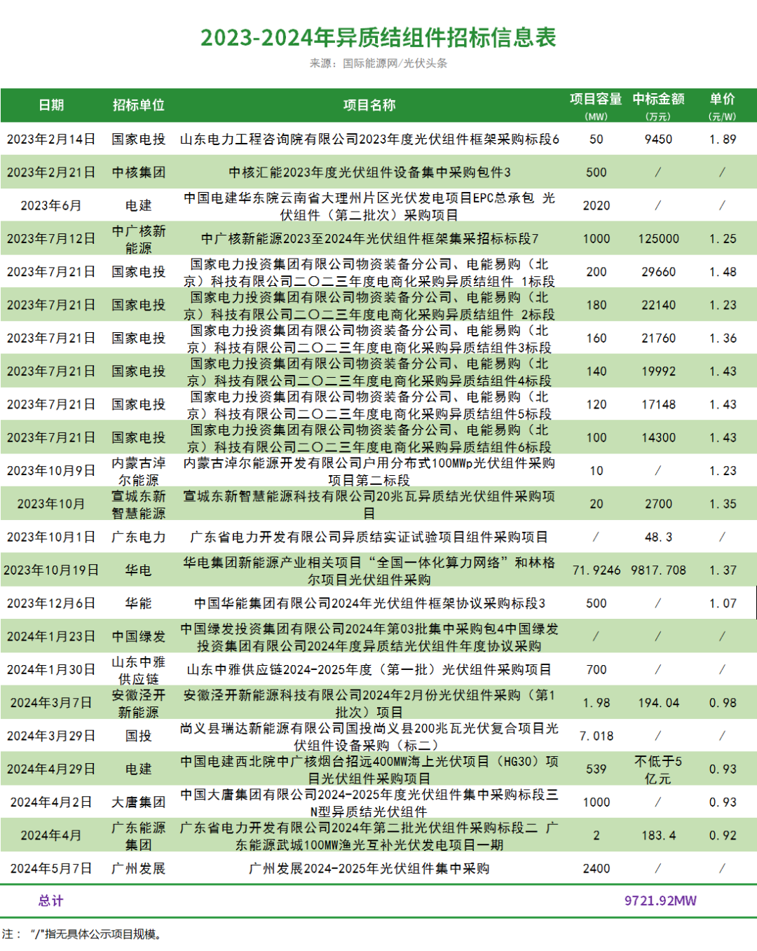 据/光伏头条(PV-2005)统计,从2023年到今年5月,异质结组件招标项目有23个招标项目,合计定标容量9721.92MW。