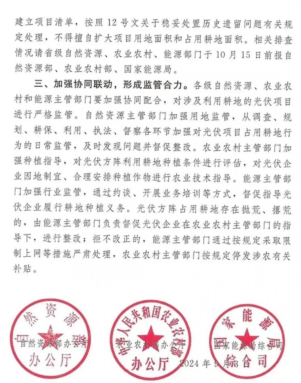 2024年9月,自然资源部、农业农村部、国家能源局联合发布《关于进一步规范光伏项目利用耕地有关问题的通知》。