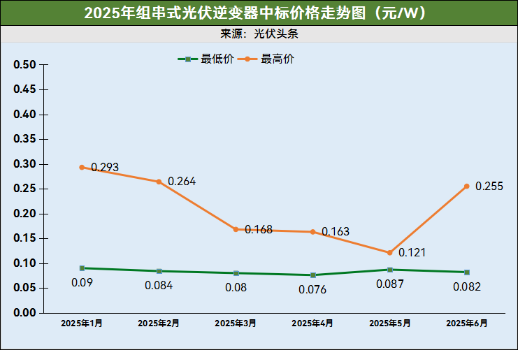 集中式逆变器最低价项目为江河机电济宁君阳电站2025年逆变器技术改造升级项目采购,项目为技改项目,采购5台500kW集中式逆变器,项目定标价之一为0.079元/W。