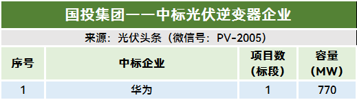本统计周期,国投集团有1个项目定标。华为成为最大赢家,获得770MW订单。