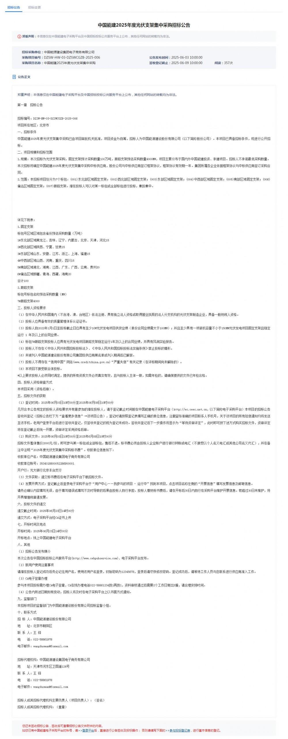 6月3日,中国能建2025年度光伏逆变器集中采购项目招标公告发布。