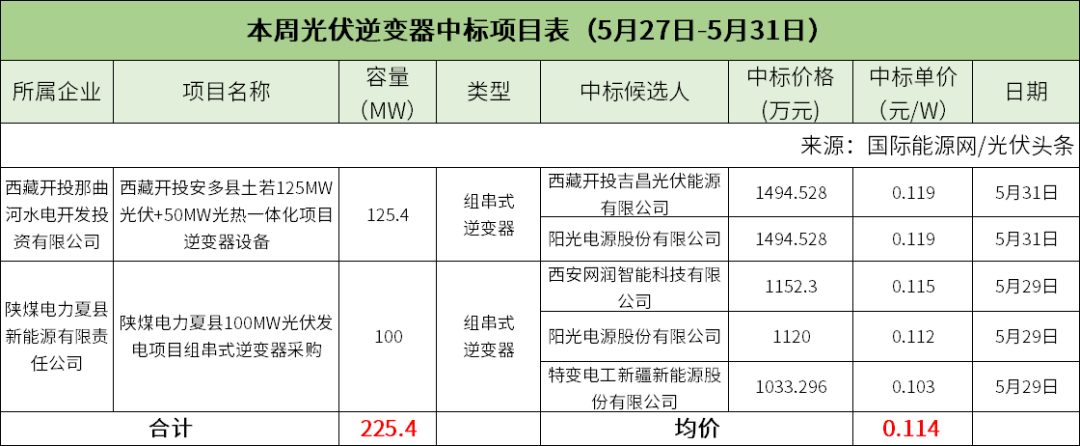西藏开拓以及陕煤电力的光伏逆变器采购项目有明确中标价格,规模合计225.4MW,中标单价为0.114元/W。