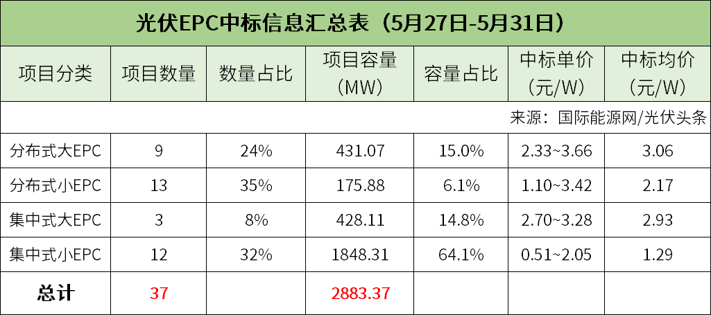 从中标项目的分类来看,本周分布式大EPC项目为9个,项目容量为431.07MW,中标价格落在2.33~3.66元/W之间,均价为3.06元/W。本周集中式大EPC项目3个,项目容量为428.11MW,中标价格落在2.7~3.28元/W之间,均价为2.93元/W。