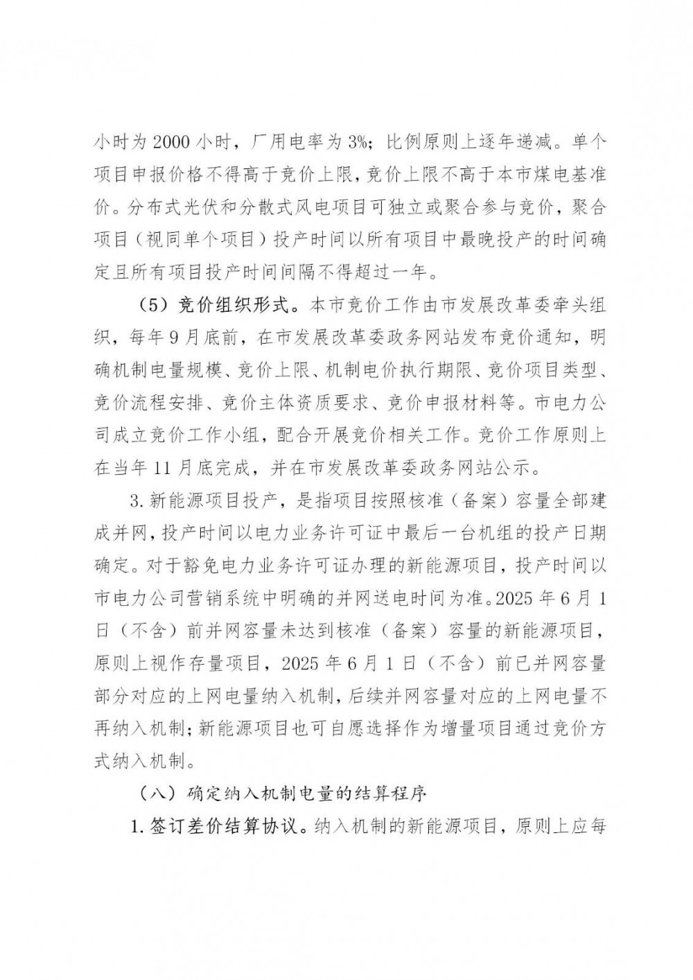 执行期限。按照当年同类项目回收初始投资的平均期限确定,原则上不高于12年。起始时间按项目申报的投产时间确定,入选时已投产的项目按入选时间确定。如入选项目未按期投产,延期六个月(含)以内的,投产前对应的机制电量自动失效;延期六个月以上的,该项目当次竞价入选结果作废,且项目投资方所有新能源项目三年内不得参与机制电价竞价。单个项目竞价方式。单个项目申报电量规模上限按照预计年上网电量的一定比例确定。预计年上网电量根据装机容量乘以年度平均发电利用小时数并扣除厂用电后确定,本市光伏发电年度平均发电利用小时为1450小时,风电年度平均发电利用小时为2000小时,厂用电率为3%;比例原则上逐年递减。单个项目申报价格不得高于竞价上限,竞价上限不高于本市煤电基准价。分布式光伏和分散式风电项目可独立或聚合参与竞价,聚合项目(视同单个项目)投产时间以所有项目中最晚投产的时间确定且所有项目投产时间间隔不得超过一年。