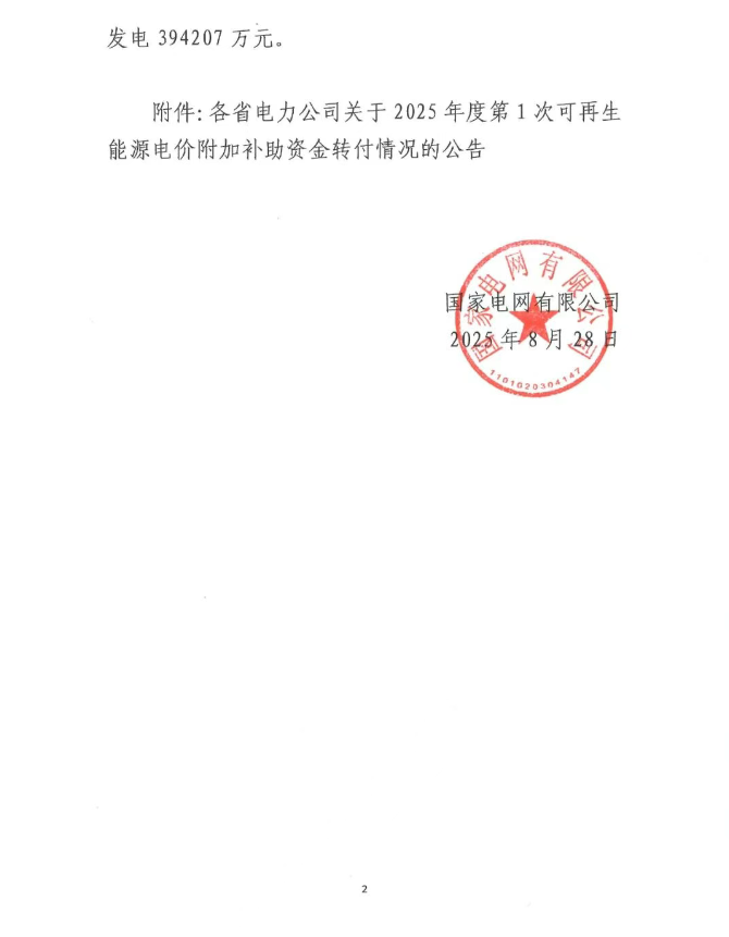 新能源圈获悉,9月15日,国网新能源云发布国家电网有限公司关于2025年度第1次可再生能源电价附加补助资金转付情况的公告。