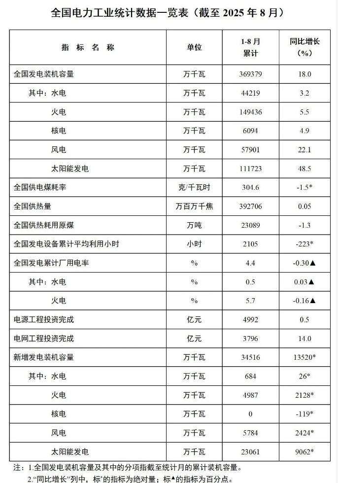 新能源圈获悉,9月26日,国家能源局发布1-8月份全国电力工业统计数据。