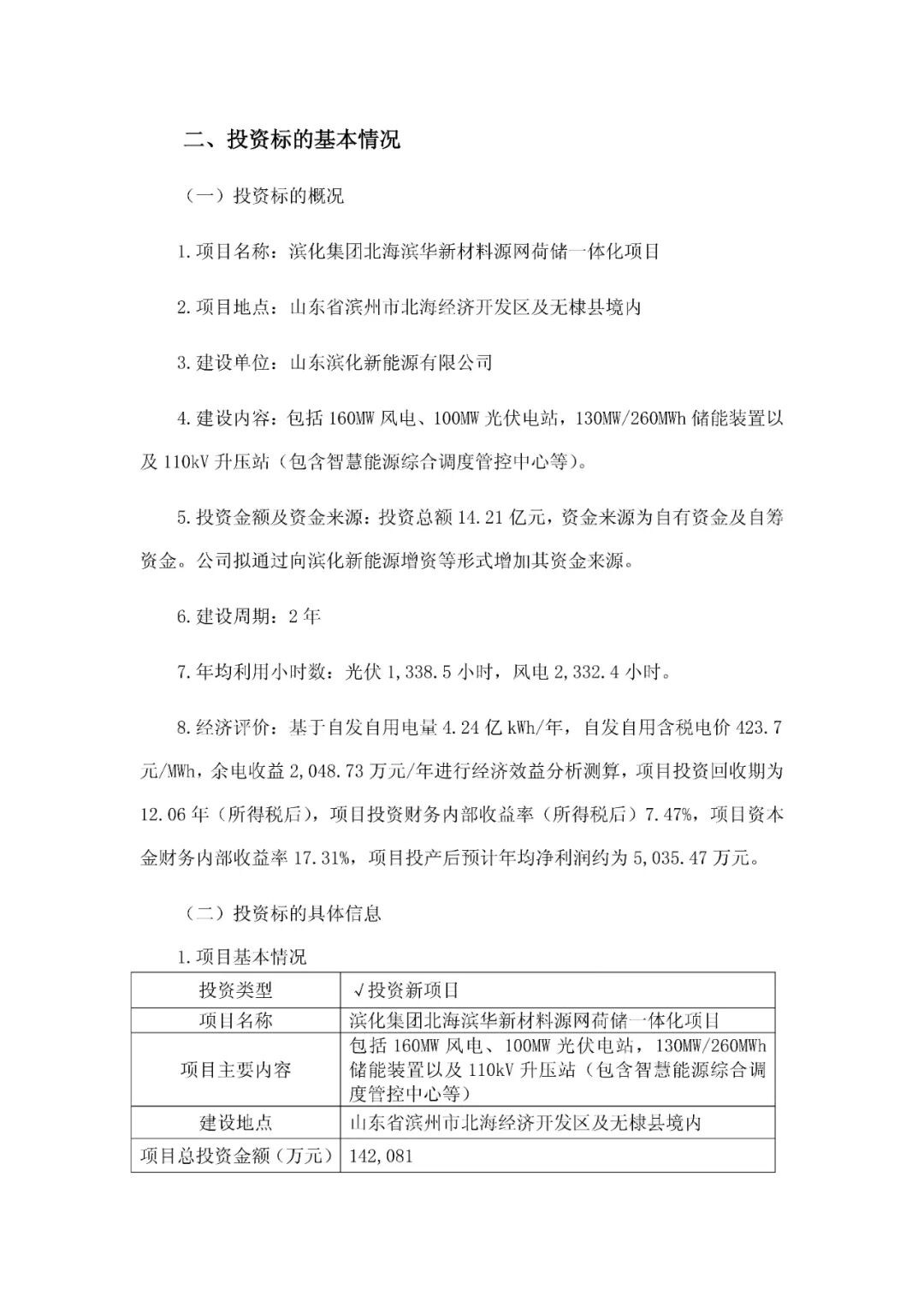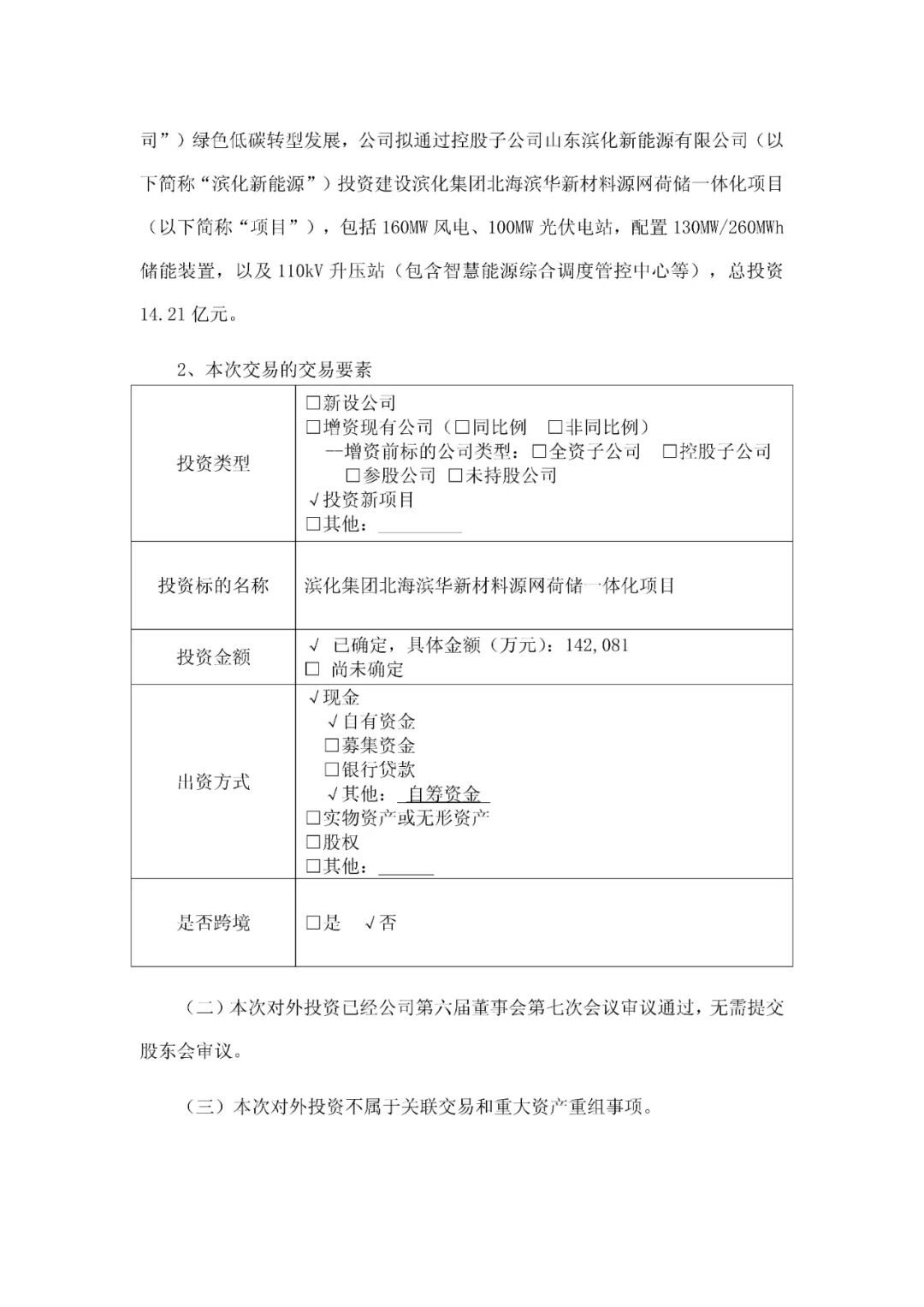 公告指出,公司拟通过控股子公司山东滨化新能源有限公司(简称“滨化新能源”)投资建设滨化集团北海滨华新材料源网荷储一体化项目。