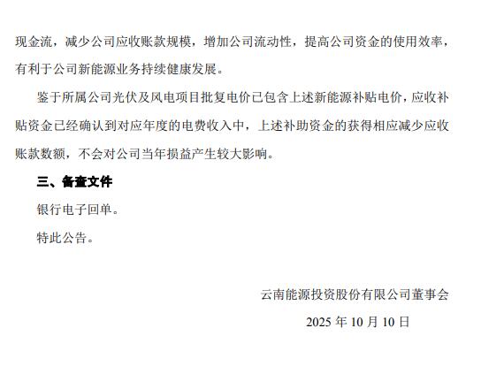 10月10日,云南能投发布关于所属公司获得国家可再生能源电价附加资金补助的自愿性信息披露公告。