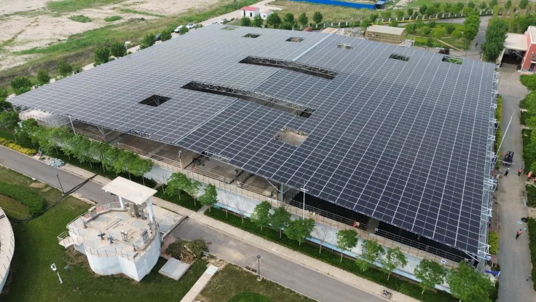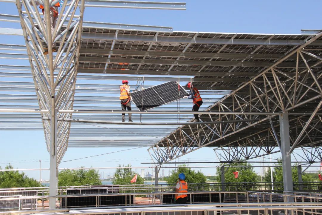 项目中桁架结构最大跨度达到34.7米,这一创新设计不仅提升了整体结构的稳定性,更在视觉效果上达到了极致。大跨度的桁架结构让光伏电站呈现出一种独特的艺术美感,与周围的环境和谐相融。不仅减少了结构立柱的数量,还使得光伏电站更加轻便、美观,成为城市中的一道亮丽风景线。