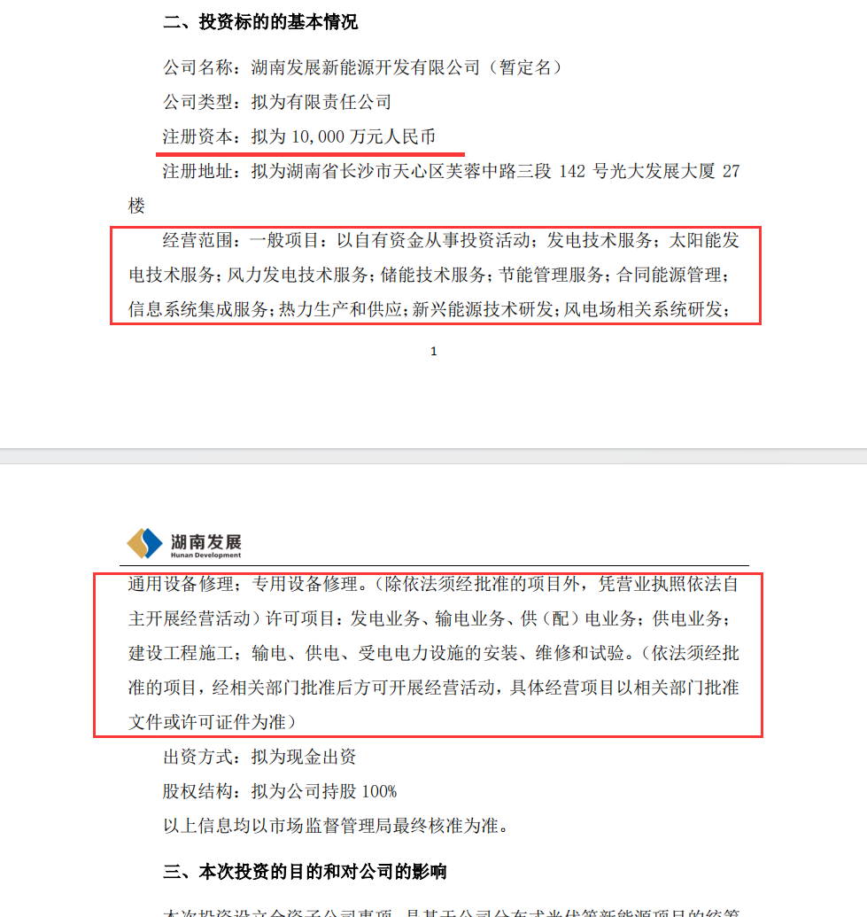公告显示,湖南发展新能源经营范围包括一般项目:以自有资金从事投资活动;发电技术服务;太阳能发电技术服务;风力发电技术服务;储能技术服务;节能管理服务;合同能源管理;信息系统集成服务;热力生产和供应;新兴能源技术研发;风电场相关系统研发;2通用设备修理;专用设备修理。(除依法须经批准的项目外,凭营业执照依法自主开展经营活动)许可项目:发电业务、输电业务、供(配)电业务;供电业务;建设工程施工;输电、供电、受电电力设施的安装、维修和试验。(依法须经批准的项目,经相关部门批准后方可开展经营活动,具体经营项目以相关部门批准文件或许可证件为准)。