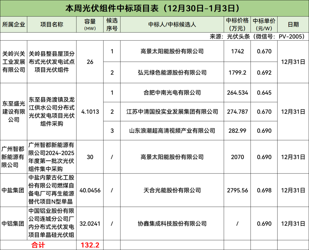 本周中盐集团、中铝集团等企业光伏组件中标项目有明确中标价格,合计规模132.2MW,其中最高价为0.698元/W,最低价为0.645元/W。