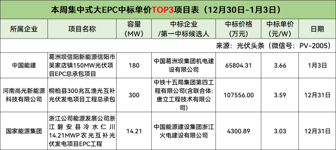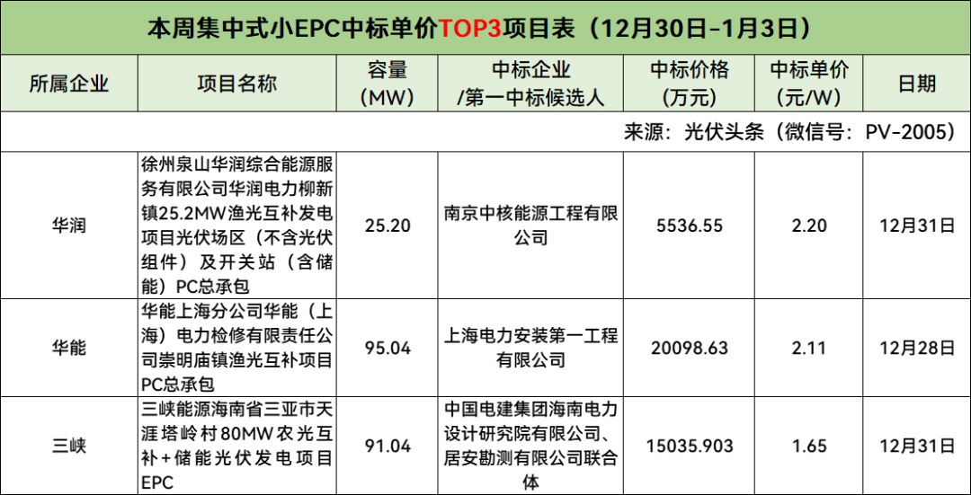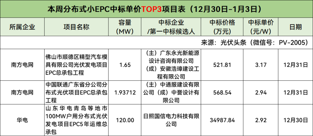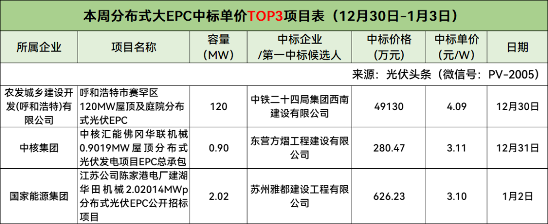此外,本周分布式小EPC、集中式小EPC中标单价Top3项目具体情况如下: