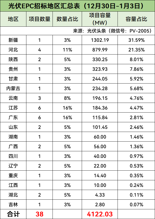 对2025年1月第1周(12月30日-1月3日)光伏EPC招/中标项目公开信息不完全统计,本周招标规模合计4122.03MW,中标规模合计2425.4MW,招中标规模合计6547.43MW。