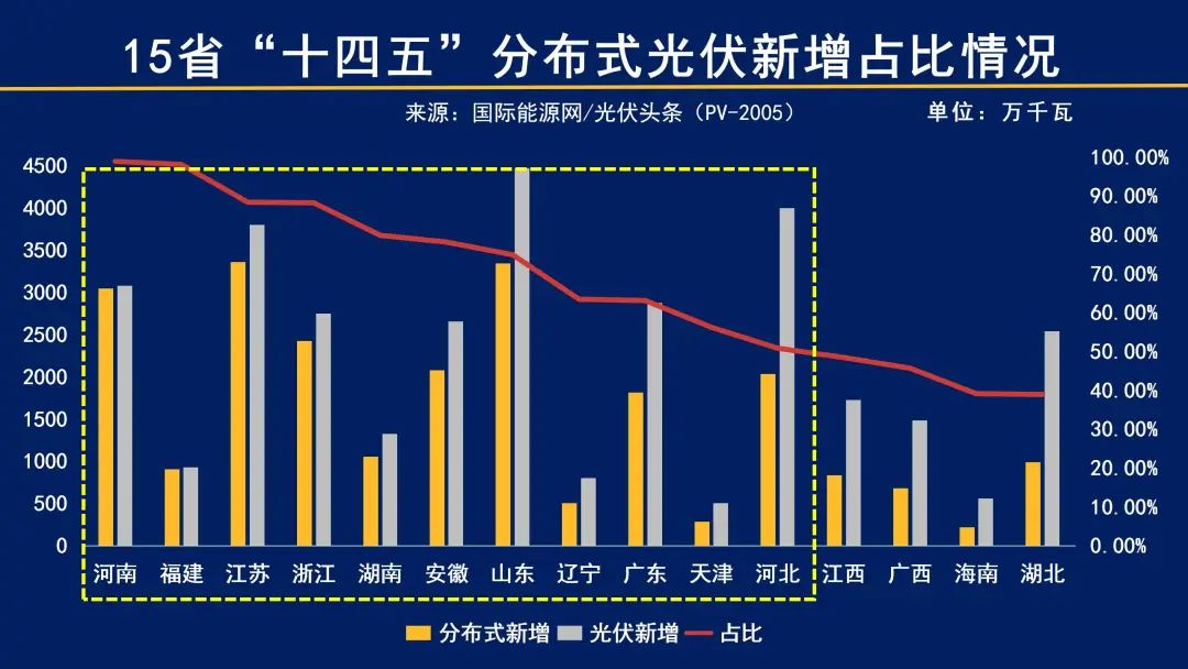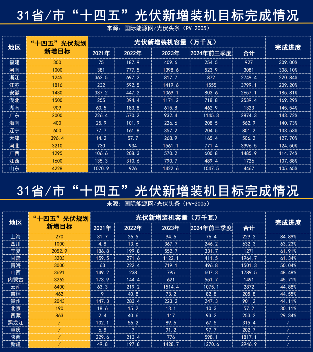 统计后发现,福建、河南、浙江、江苏、安徽、湖北、湖南、广东、海南、辽宁、天津、河北、广西、江西、山东15省超额完成“十四五”光伏新增目标。